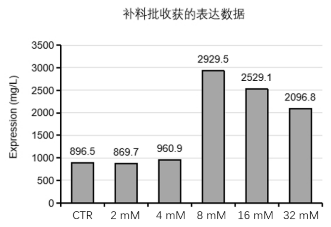 此前,并無高效表達人類神經生長因子(human never growth factor,hNGF)的培養方法,極大限制了 hNGF 的大規模生產和在臨床與藥物方面的應用。漢騰生物采用補料分批培養方法,并發現了新的添加劑,可以將 hNGF 重組蛋白的表達量提高至少 100%,產量最高可提升至 2900 mg/L左右(圖 2),較大地提升了 hNGF 在 CHO 細胞中的表達水平(詳細內容參考漢騰專利:重組神經生長因子的高效表達方法,CN2023108028220)。