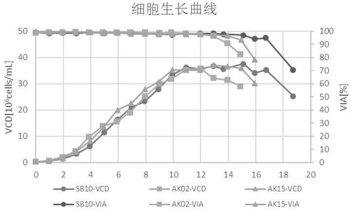 圖 3. 活細胞密度(VCD)和細胞活率(VIA)。SB-10:環軌搖晃式生物反應器;AK02:3 L攪拌式生物反應器;AK15:15 L攪拌式生物反應器