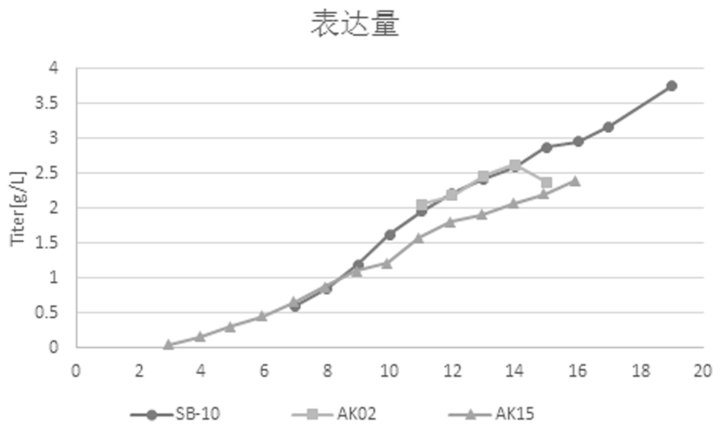 圖 4. 蛋白表達量。SB-10:環軌搖晃式生物反應器;AK02:3 L攪拌式生物反應器;AK15:15 L攪拌式生物反應器