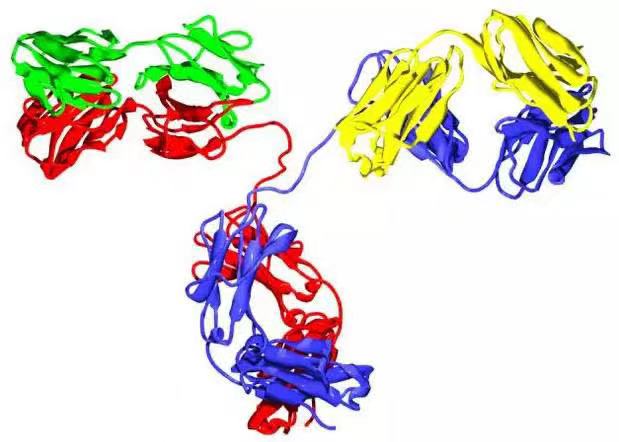 抗體是一種高分子球狀血液蛋白質,重量約為150kDa。由于在部分氨基酸殘基中含有糖鏈,抗體也是一種糖蛋白。能發揮功能的基本單位是一個免疫球蛋白單體。在分泌形態的抗體中包括:二聚體IgA、真骨附類魚的四聚體IgM以及哺乳動物的五聚體IgM。